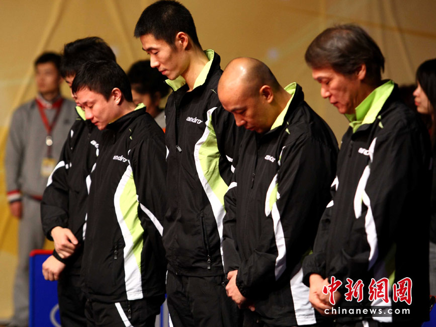 4月15日,亚欧乒乓球全明星对抗赛在北京进行第二天的争夺。赛前,现场所有球员和观众为青海玉树地震灾区的遇难同胞默哀一分钟,组委会宣布将把本次赛事的全部票房收入捐赠地震灾区。中新社发 富田 摄
