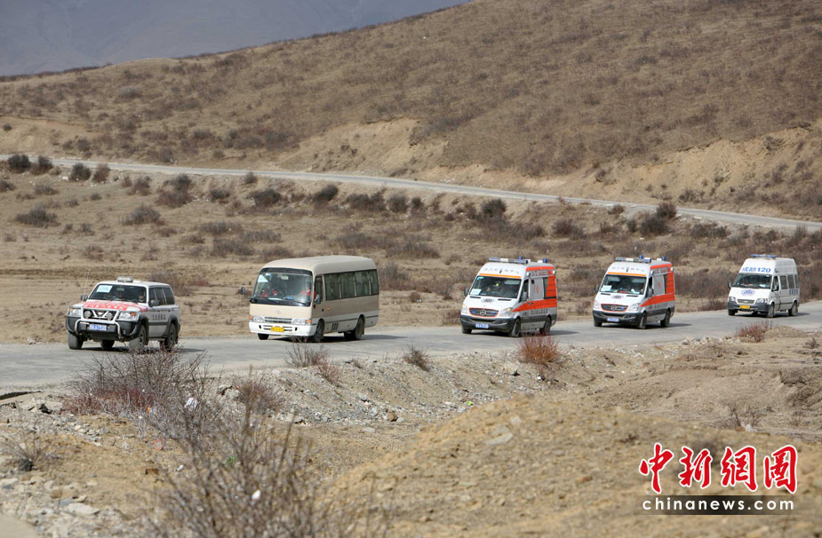 4月16日,四川省卫生厅从成都派出首支国家医疗救援队经过1200余公里,40小时的长途跋涉,医疗救援车队平安抵达青海省玉树地震重灾区。图为医疗车队正在翻越海拔5000多米的海子山。中新社发 刘忠俊 摄