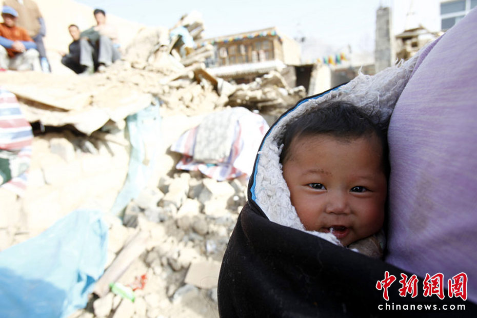 图为4月15日,玉树,三个月大的白玛才措被母亲抢救出来。青友 摄
