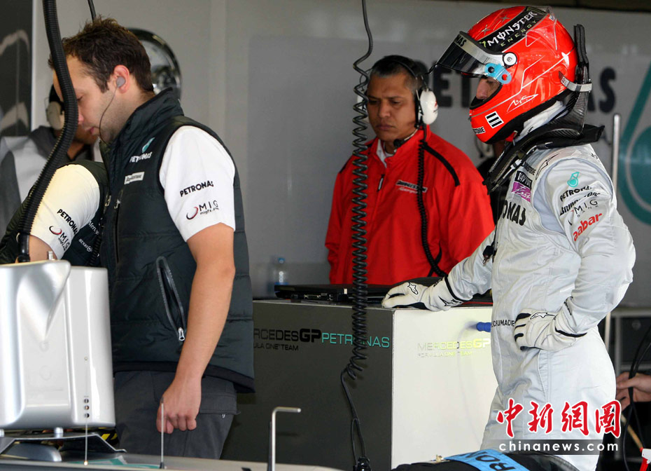 4月16日,2010国际汽联F1世界锦标赛上海站在上海国际赛车场开始车手第一、第二次练习赛。图为代表梅赛德斯GP车队出战的老车王、德国车手舒马赫重回上海赛道。 中新社记者 任晨鸣 摄