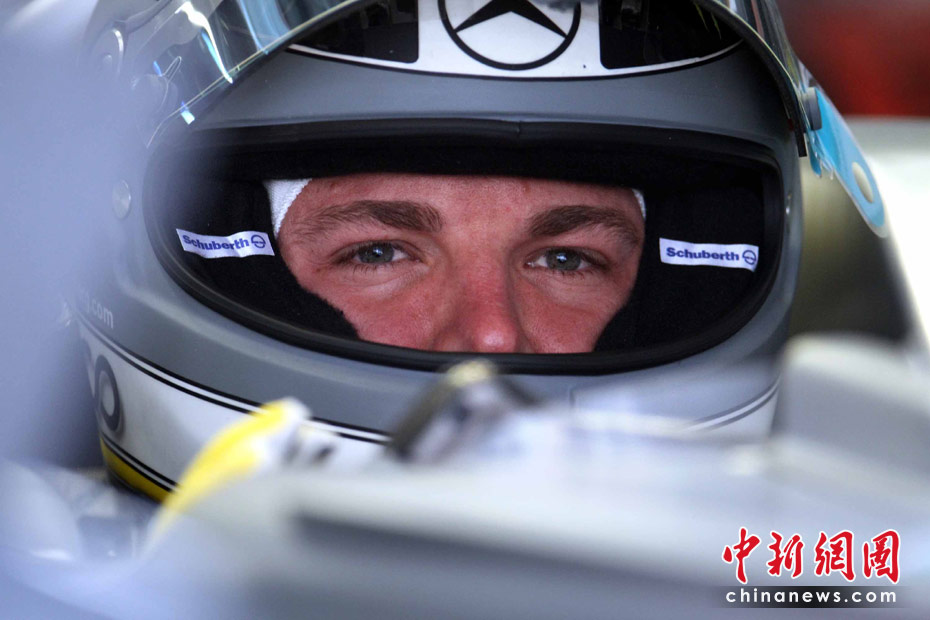 4月16日,2010国际汽联F1世界锦标赛上海站在上海国际赛车场开始车手第一、第二次练习赛。图为代表梅赛德斯GP车队出战的德国车手罗斯伯格。 中新社记者 任晨鸣 摄
