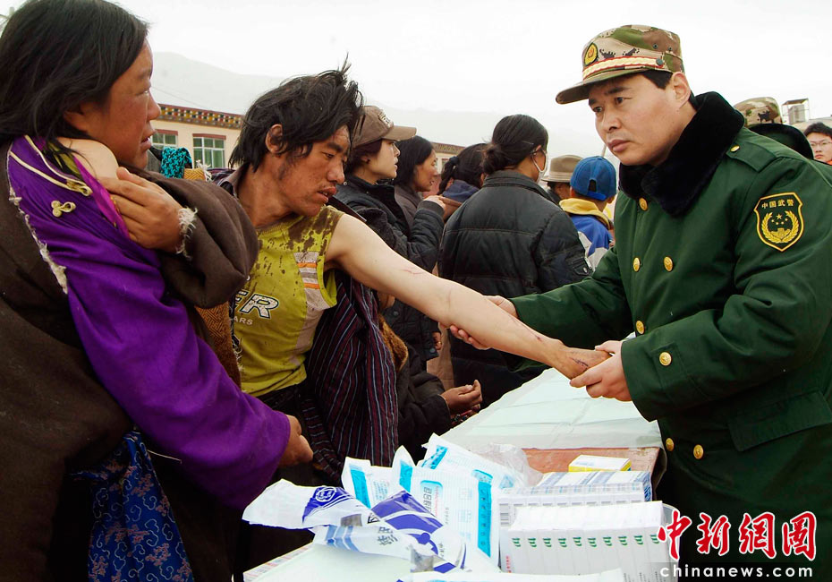 4月16日上午,广东边防总队抗震救灾医疗队在青海玉树州结古镇民族师范学院广场设立救治点,当日救助地震灾区伤员200多名。中新社发 陈森阳 摄