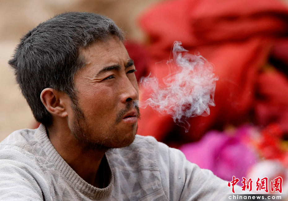 2010年4月16日,青海玉树藏族自治州玉树县结古镇一所中学的震灾救援现场,一名救援人员在短暂的休息期间吸烟解乏。中新社发 盛佳鹏 摄