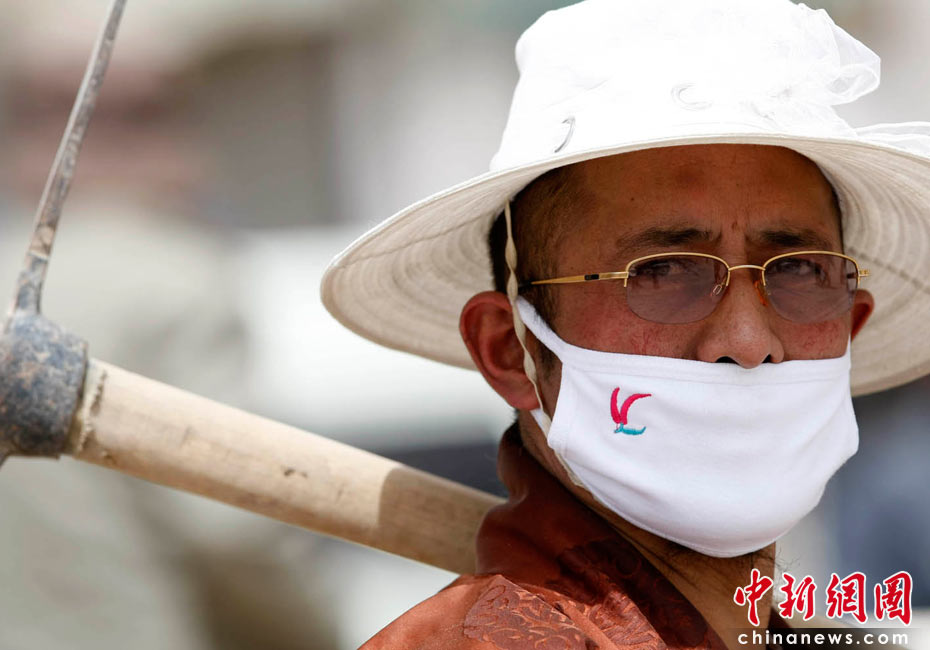 2010年4月16日,青海玉树藏族自治州玉树县结古镇震灾现场,一名志愿者准备参加救援。中新社发 盛佳鹏 摄