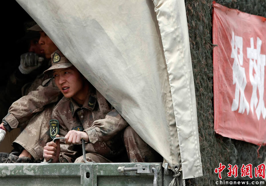 2010年4月16日,青海玉树藏族自治州玉树县结古镇,刚刚抵达的三名解放军准备投入现场救援。中新社发 盛佳鹏 摄