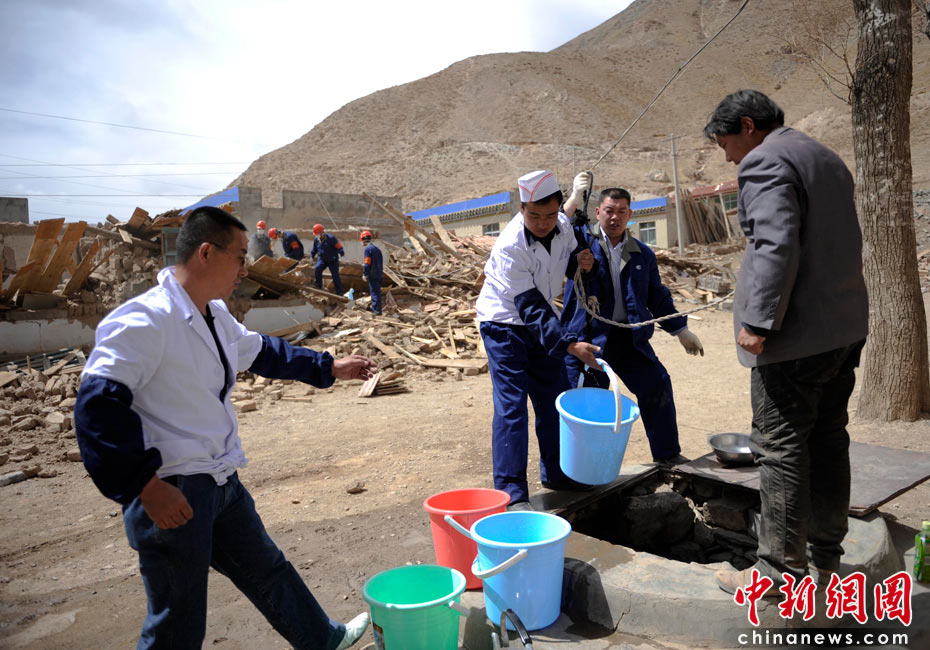 4月16日,青海玉树民族综合职业学校生活保障人员提取地下水饮用。中新社发 廖攀 摄