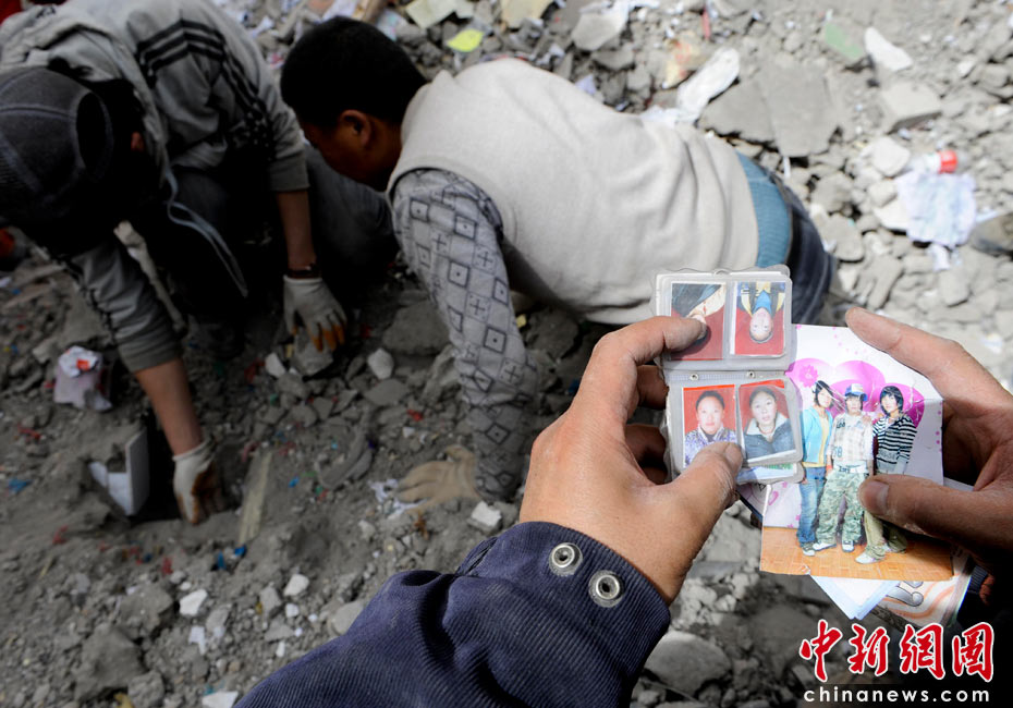 4月16日,青海玉树民族师范学校内,玉树州教育局官员扎西手持学生照片焦急等待现场救援进展。中新社发 廖攀 摄
