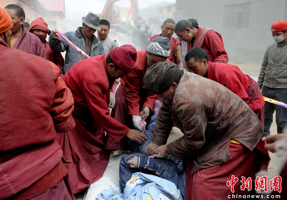 4月16日,青海玉树民族师范学校坍塌的女生宿舍楼内,僧侣们正在协助救援人员挖掘遇难者遗体。中新社发 廖攀 摄