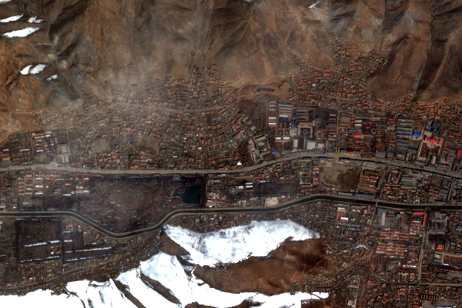 利用对地观测中心2010年4月16日获取的高分辨率航空遥感数据,提取出玉树州结古镇城区范围内地震破坏最严重或典型地区,使之与GoogleEarth中相应位置的震前遥感卫星数据进行对比,直观展现结古镇在此次地震中的受影响程度。图片来源:中国科学院