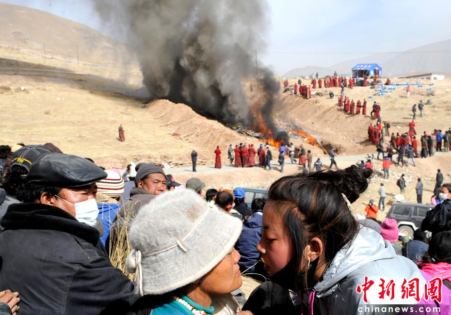 4月17日,青海省玉树县结古镇附近的山坡上,众多地震遇难者遗体被火葬。当日,为妥善及时处理遇难人员遗体,预防灾区疫情的发生与流行,青海出台地震遇难人员遗体处理意见,强调在处理遗体时要尊重少数民族丧葬习俗,尊重死者尊严。中新社发 廖攀 摄