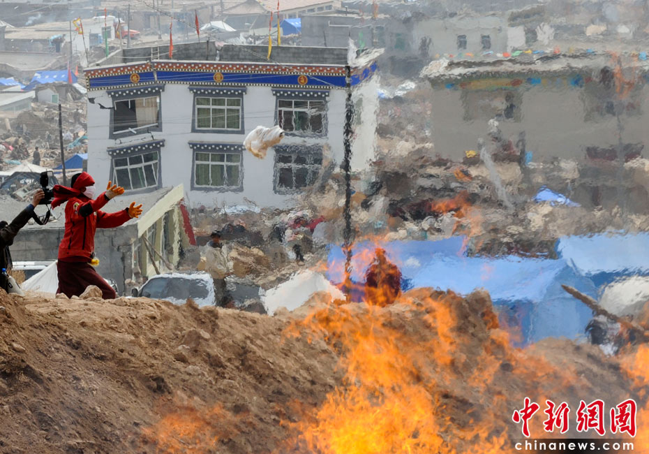 4月17日,青海省玉树县结古镇附近的山坡上,众多地震遇难者遗体被火葬。当日,为妥善及时处理遇难人员遗体,预防灾区疫情的发生与流行,青海出台地震遇难人员遗体处理意见,强调在处理遗体时要尊重少数民族丧葬习俗,尊重死者尊严。图为众多僧侣为逝者祈祷。中新社发 廖攀 摄