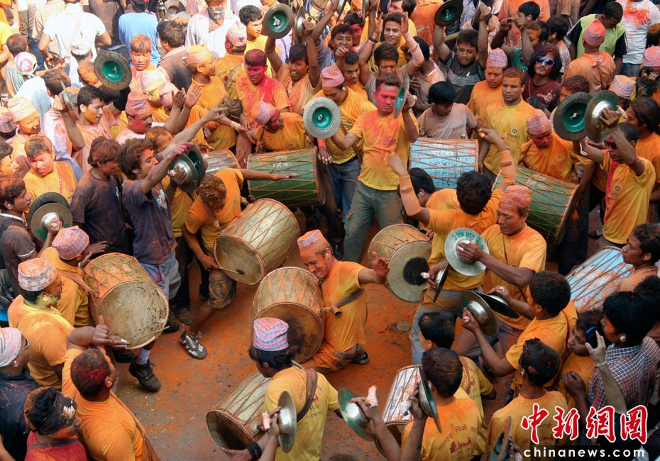 尼泊尔欢庆尼历新年 人群街头洒红狂欢