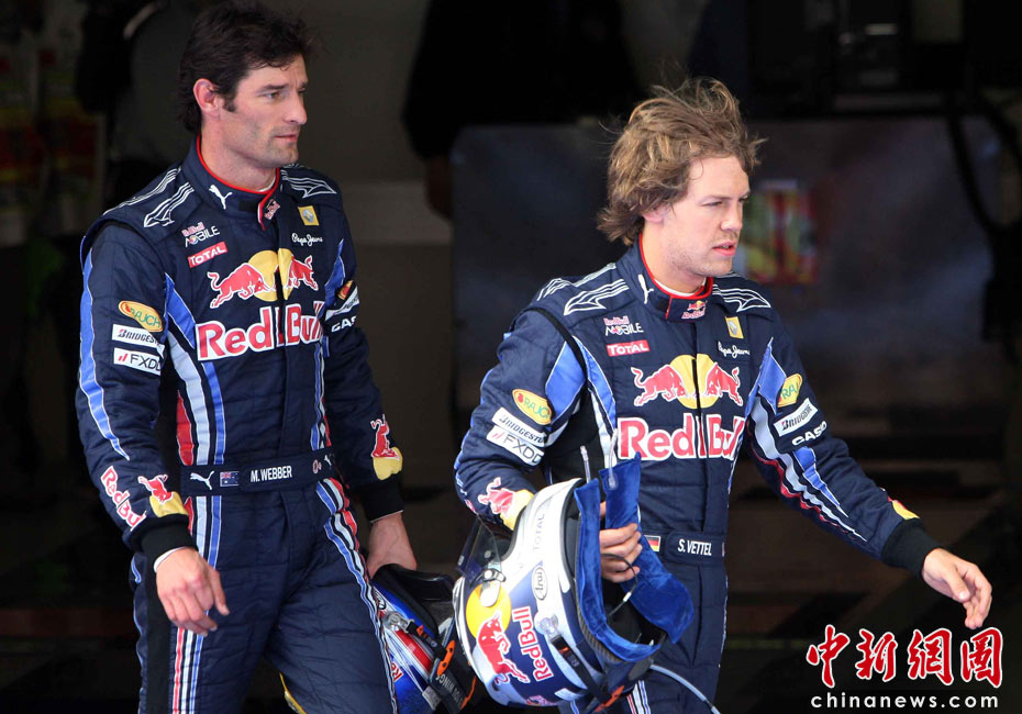 4月17日下午,2010国际汽联F1世界锦标赛上海站在上海国际赛车场举行排位赛,代表红牛车队出战的德国车手维特尔(右)获得杆位,队友、澳大利亚车手韦伯获得第二名,法拉利车队的西班牙车手阿隆索获得第三名。中新社记者 任晨鸣 摄