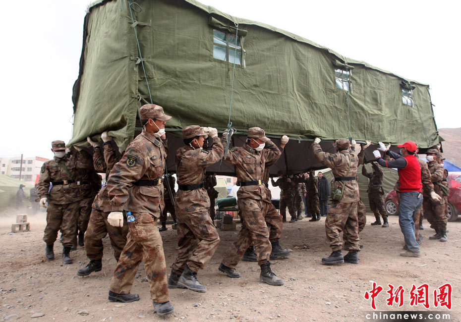 4月17日,青海玉树体育场受灾民众安置点内,解放军救援队为安置点整体搬迁帐篷。中新社发 盛佳鹏 摄