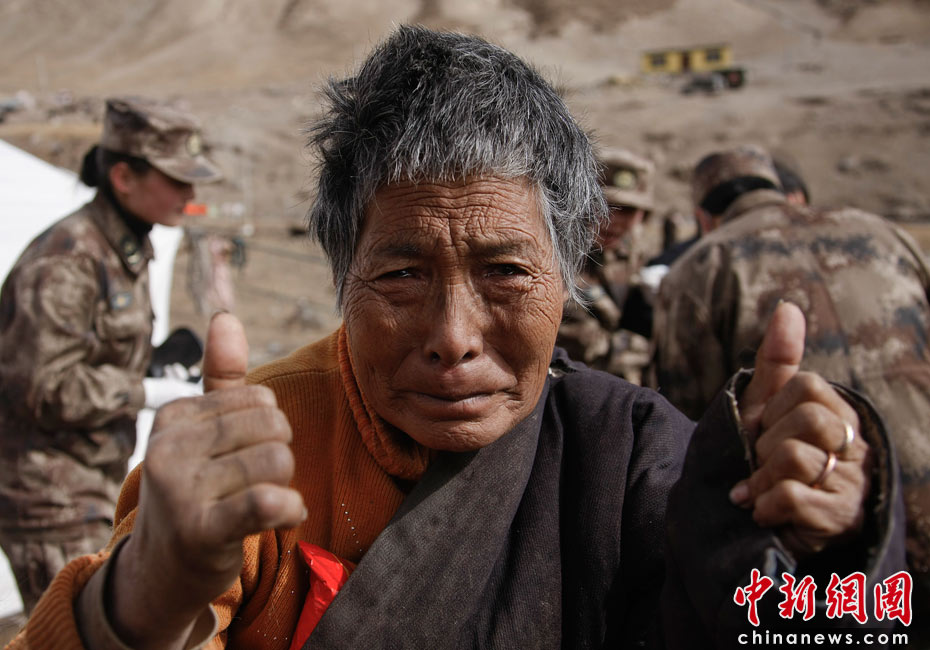 4月18日,总后青藏兵站部抗震医疗队在青海玉树震中结古镇展开救援的同时,还派员向周边牧区巡诊,救治伤病员。图为黄林格头牧区78岁的旦样老阿妈热泪盈眶地向医务人员竖起大了拇指。中新社发 邹小庆 摄
