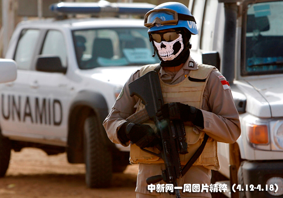 4月13日周二,在苏丹法希尔郊区的一处难民营,一名联合国驻苏丹达尔富尔维和人员正在站岗。官方表示,四名维和人员不久前在这一地区失踪。