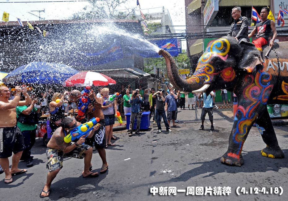 4月12日周一的泰国曼谷,一只大象在街头向游人喷水。周二泰国将迎来一年一度的泼水节,这是庆祝泰国新年的节日。