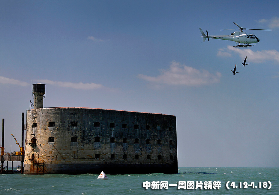 4月12日周一,在法国拉罗谢尔海岸的博涯堡垒附近,从一架直升机上跳入水中,他们正在为将于下月开始的红牛悬崖跳水世界系列赛进行训练。