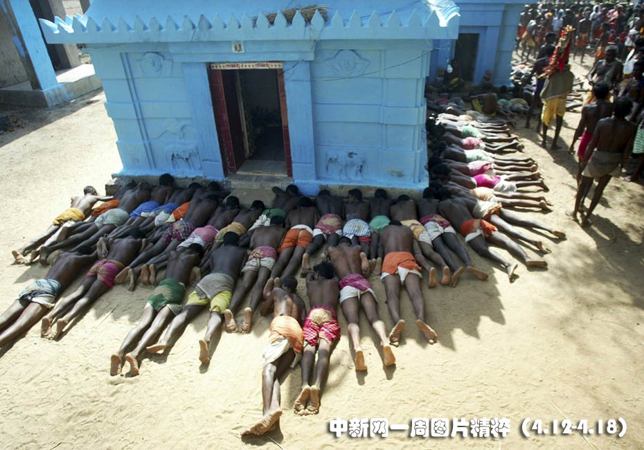 4月14日周三,印度村民拜倒在一个印度教寺庙前。