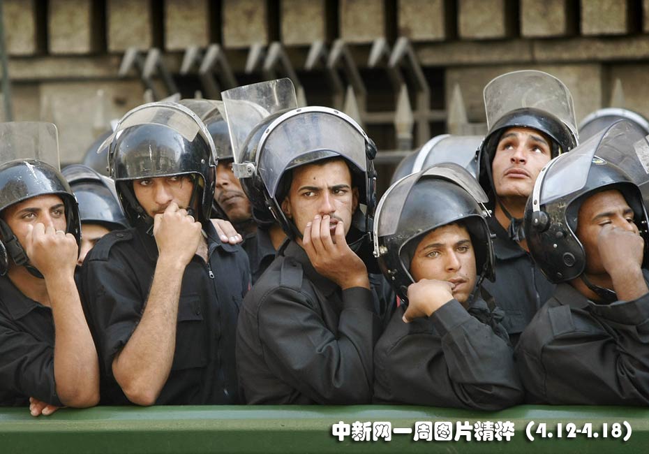 4月13日周二,埃及开罗市中心一支安全部队封锁示威者。