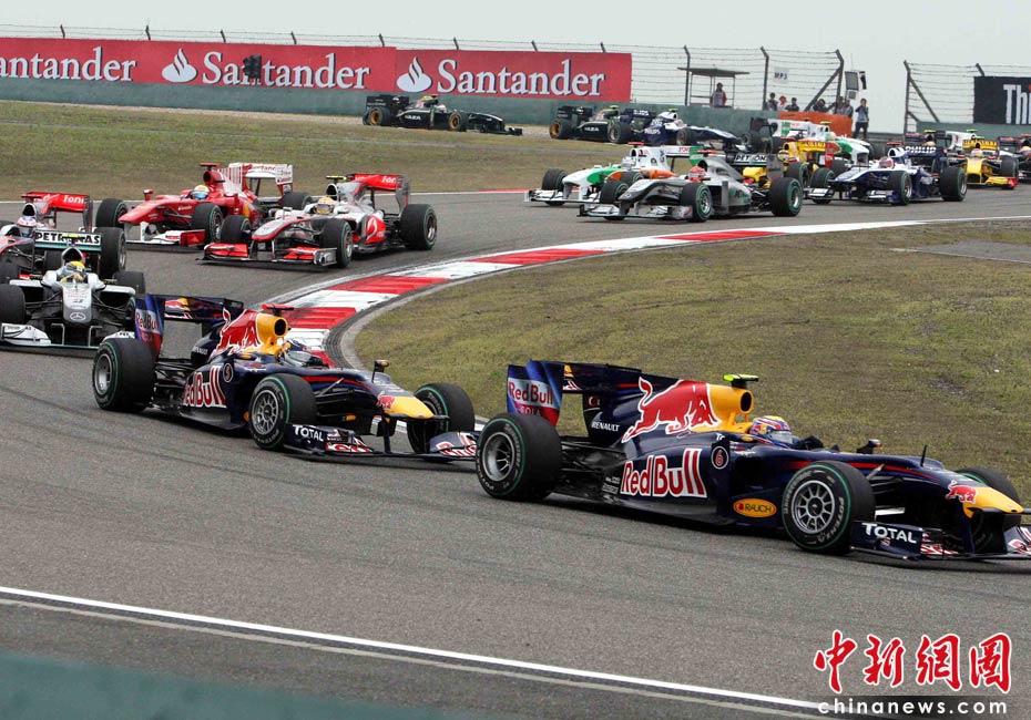 4月18日下午,2010国际汽联F1世界锦标赛上海站在上海国际赛车场举行正式比赛,迈凯轮车队的英国车手巴顿在雨中获得冠军、队友、英国车手汉密尔顿获得亚军,梅赛德斯GP车队的德国车手罗斯伯格获得季军。图为比赛发车后众位车手通过一号弯。中新社记者 任晨鸣 摄