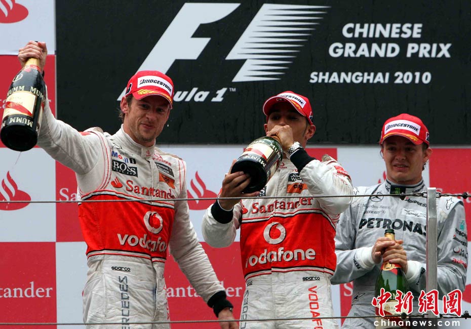 4月18日下午,2010国际汽联F1世界锦标赛上海站在上海国际赛车场举行正式比赛,迈凯轮车队的英国车手巴顿(左)在雨中获得冠军、队友、英国车手汉密尔顿(中)获得亚军,梅赛德斯GP车队的德国车手罗斯伯格获得季军。中新社记者 任晨鸣 摄
