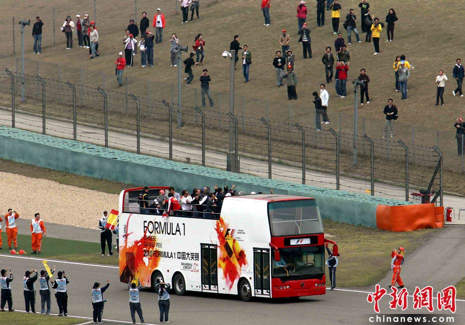 4月18日下午,2010国际汽联F1世界锦标赛上海站在上海国际赛车场举行正式比赛,赛前24名参赛车手按照惯例乘坐敞篷车环绕赛场一周与车迷见面,但是寥寥无几的观众与阴沉的天气使上海F1赛事创下开赛七年以来观众人数最低的纪录。中新社记者 任晨鸣 摄