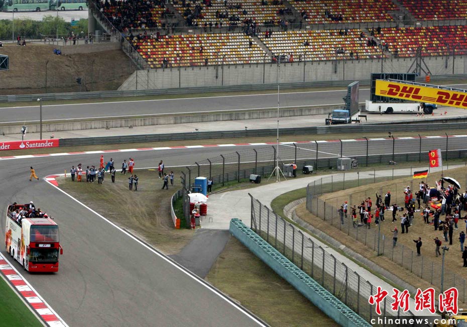4月18日下午,2010国际汽联F1世界锦标赛上海站在上海国际赛车场举行正式比赛,赛前24名参赛车手按照惯例乘坐敞篷车环绕赛场一周与车迷见面,但是寥寥无几的观众与阴沉的天气使上海F1赛事创下开赛七年以来观众人数最低的纪录。中新社记者 任晨鸣 摄