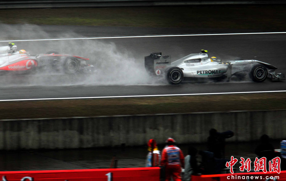 图为汉密尔顿雨中超越罗斯伯格。中新社记者 任晨鸣 摄