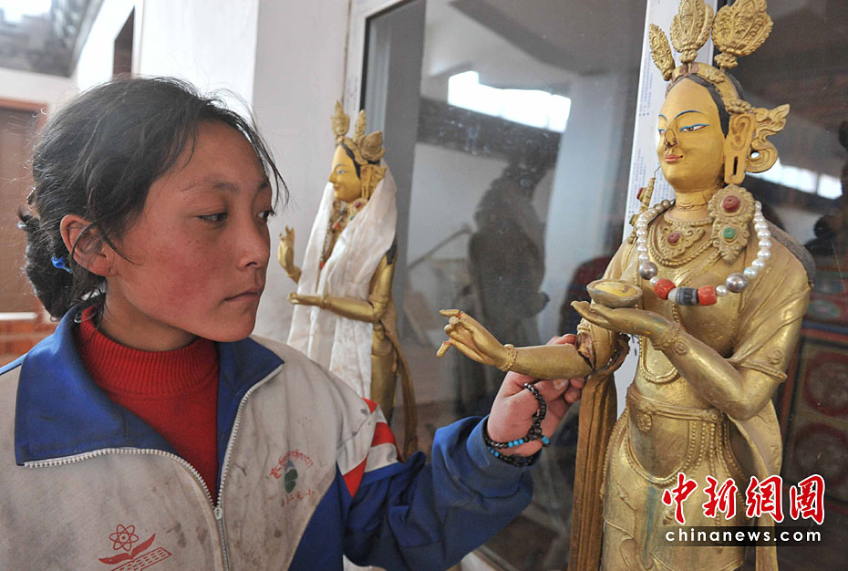 4月19日,新闻记者首次进入青海玉树7.1级强烈地震的震中点上拉秀乡日麻村,奇迹是全村无一伤亡,位于村中心、正在新修的查荣寺里,两尊文成公主的塑像局部损坏。中新社发 贾国荣 摄