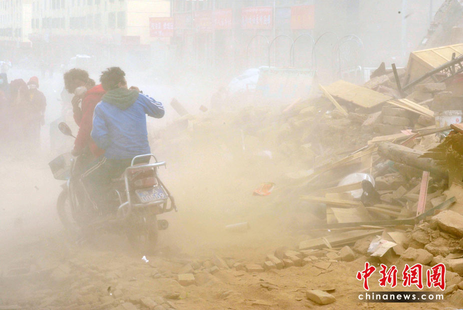 4月中旬青海玉树地震灾区风沙迷漫,结古镇受灾民众在风尘滚滚中艰难出行。中新社发 贾国荣 摄