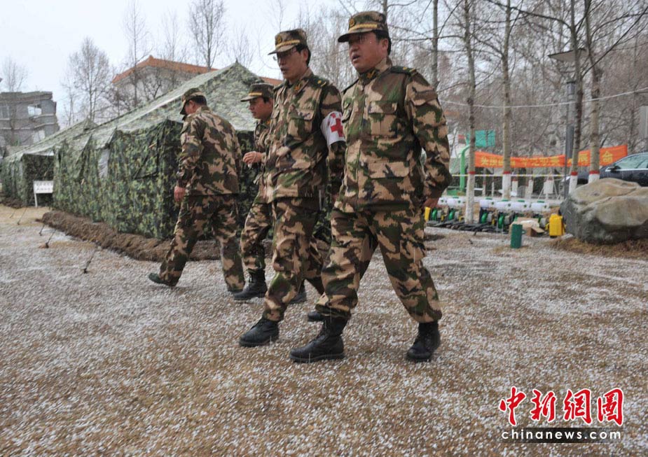 4月20日12时许,玉树地震灾区突然雷雹交加,青海武警总队医疗救护队帐篷前一片雪白,军医立刻商量救护对策。中新社发 贾国荣 摄
