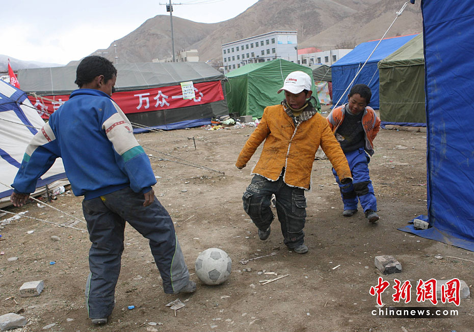 4月20日,青海省玉树州体育场里,几名少年在震后搭建的帐篷间踢足球。中新社发 苏丹 摄