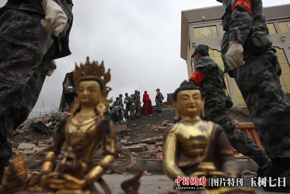 4月17日,青海玉树结古镇民主路,解放军救援队为受灾民众从房屋废墟内搜索出多件法器。中新社发 盛佳鹏 摄