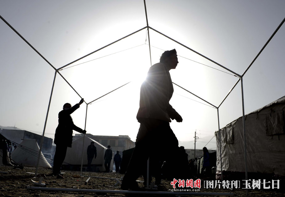 青海玉树县体育场的地震灾民安置点内,玉树地震灾民正在积极自建抗震帐棚。中新社发 廖攀 摄
