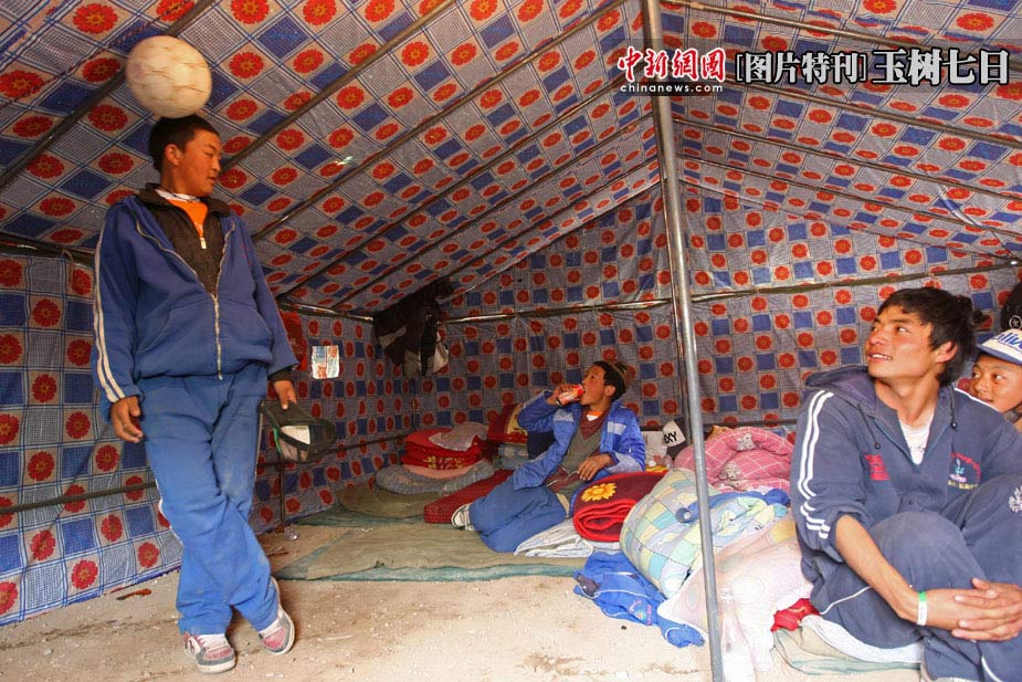 2010年4月19日,青海玉树县结古镇玉树县第一民族中学的学生宿舍帐篷内,德尕扎西(左)在其他同学面前表演球技,称自己是“C罗”。中新社发 盛佳鹏 摄
