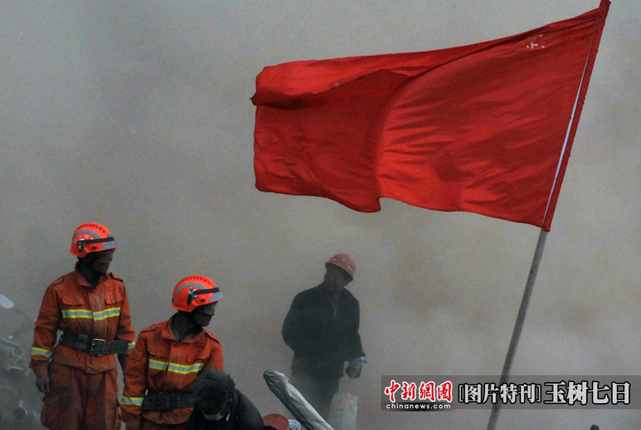 4月20日,青海玉树地震灾区风沙迷漫,各地救援队在结古镇灾区烟尘中坚持抗震救灾。中新社发 盛佳鹏 摄