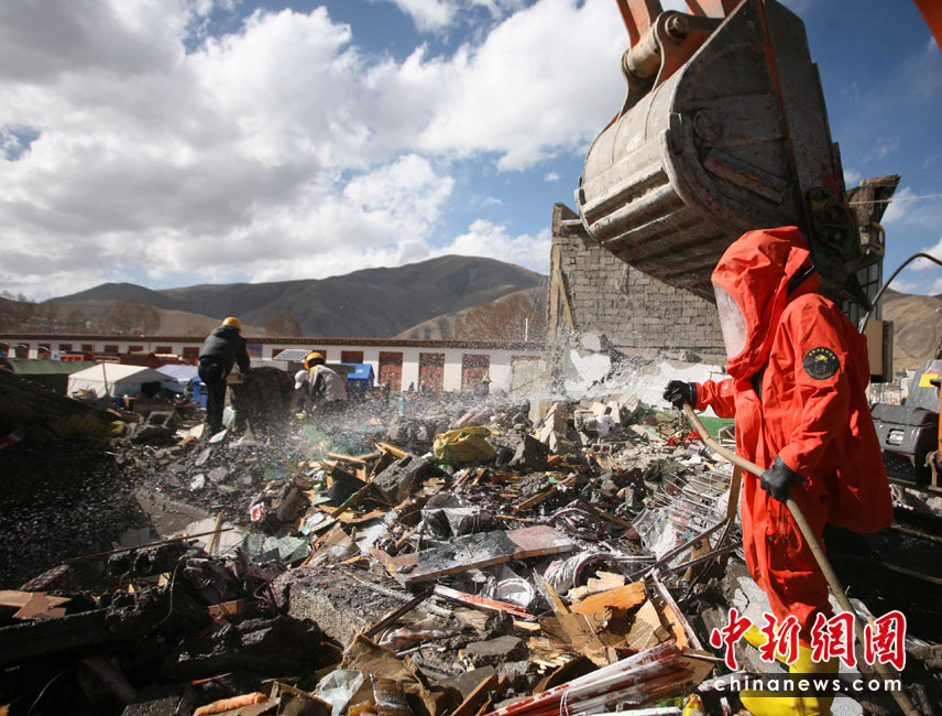 4月20日,来自四川内江军分区陆军预备役防化团开始对玉树城区废墟展开消毒工作。地震发生以后卫生部门加强对震区消毒防疫工作力度,防疫人员开始对废墟、灾民安置区展开拉网式消毒防疫,重点预防鼠疫、水质污染,确保大灾之后无大疫。中新社发 刘忠俊 摄