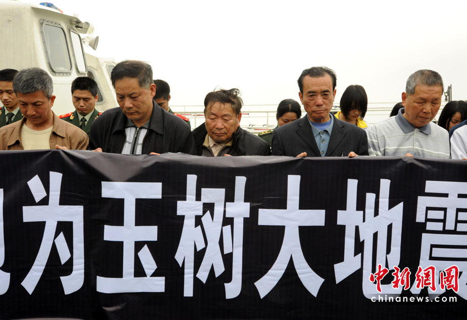 4月21日上午,福州边防支队马尾大队公边艇警笛长鸣,百余名边防官兵与驻地闽安中学师生、侨胞、台胞手持黄菊花、胸戴小白花,肃立默哀3分钟,以表达对青海省玉树县地震遇难同胞的深切哀悼。图为参加该悼念仪式的福建侨胞台胞手举横幅向玉树地震遇难者默哀。中新社发 刘可耕 摄