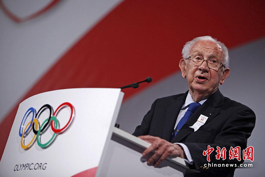 图为2009年10月2日,萨马兰奇在哥本哈根举行的第121届国际奥委会会议上讲话。