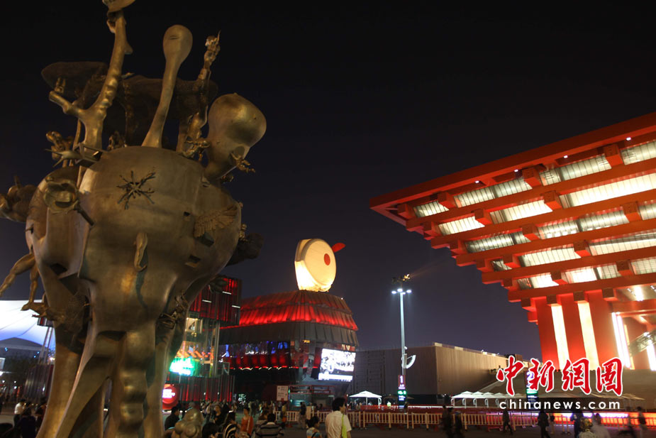 夜幕下的上海世博园区处处流露光华与璀璨,图为中国馆与一尊雕塑之间的澳门馆。中新社发 宗金柱 摄