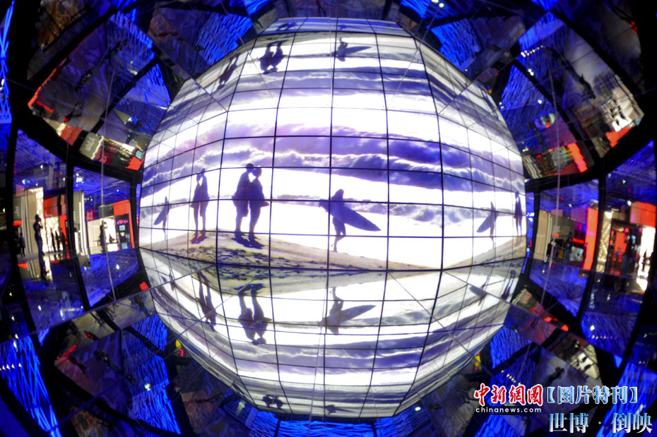 上海世博园内的巴塞罗那城市案例馆,方形屏幕在周围玻璃的倒映下形成球形视觉。中新社记者 廖攀 摄