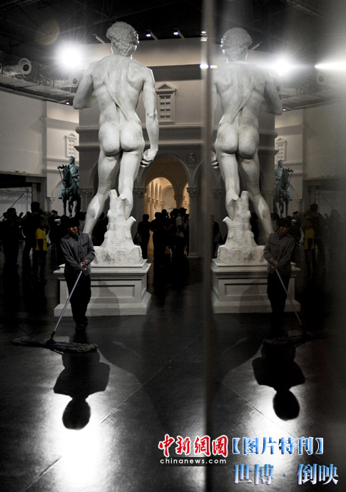 城市足迹馆里,镜中倒映着大卫雕像。中新社记者 廖攀 摄