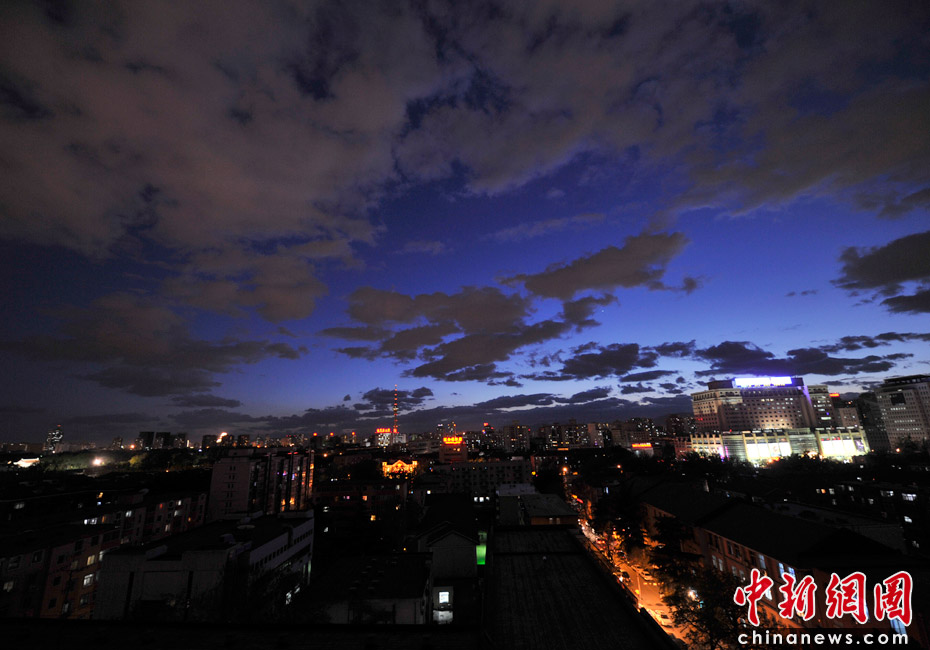 5月5日立夏,京城降雨今晨刚刚结束,雾气伺机又起。傍晚时分,随着四级北风的到来,京城天气逐渐转晴,雾气慢慢消散天空彤云密布夜色瑰丽。中新网记者 金硕 摄