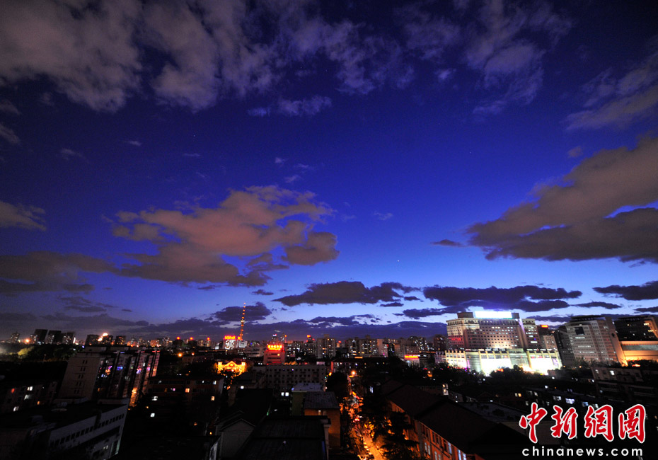 5月5日立夏,京城降雨今晨刚刚结束,雾气伺机又起。傍晚时分,随着四级北风的到来,京城天气逐渐转晴,雾气慢慢消散天空彤云密布夜色瑰丽。中新网记者 金硕 摄