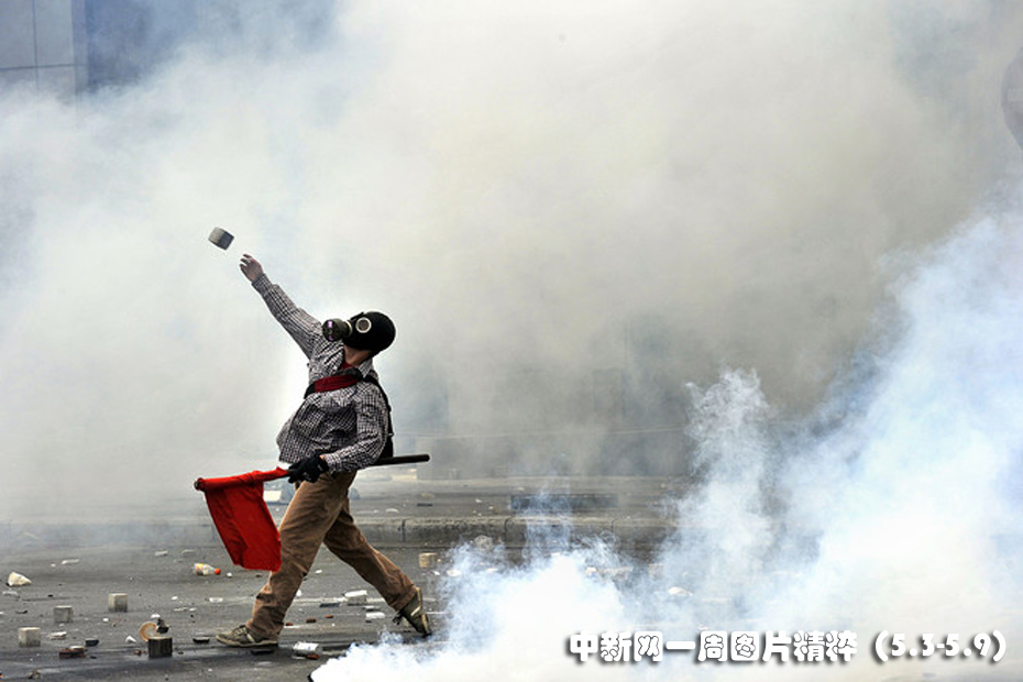 5月5日周三,在雅典的国会大楼附近,一名抗议者朝警察掷石块。