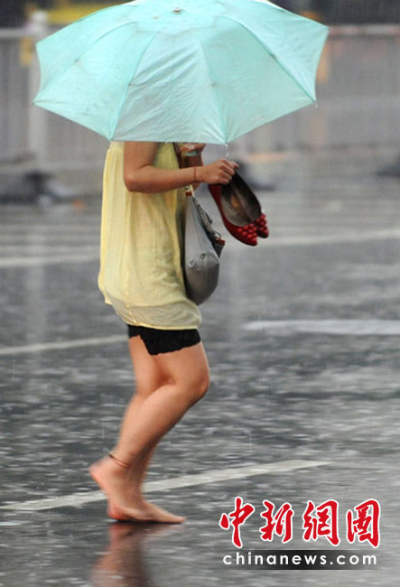 未来三天,青藏高原中东部、西南地区、江汉、江淮、江南、华南等地将持续阴雨天气,其中,广西南部、广东大部、江西南部、福建南部、海南西北部、湖北大部、湖南北部、重庆大部等地有大雨或暴雨,局地有大暴雨。图为5月9日傍晚,佛山市禅城区文华北路,一个女孩光着脚在雨中前行。崔景印 摄
