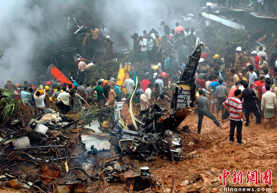 5月22日,印度一架客机在南部卡纳塔克邦门格洛尔市降落时失事,造成至少160人丧生。目击者称,当天早上6点左右,这架飞机准备在马拉格尔机场降落,但不知何故冲出跑道然后一头扎到机场附近的丛林中起火爆炸。图片来源:中国新闻网