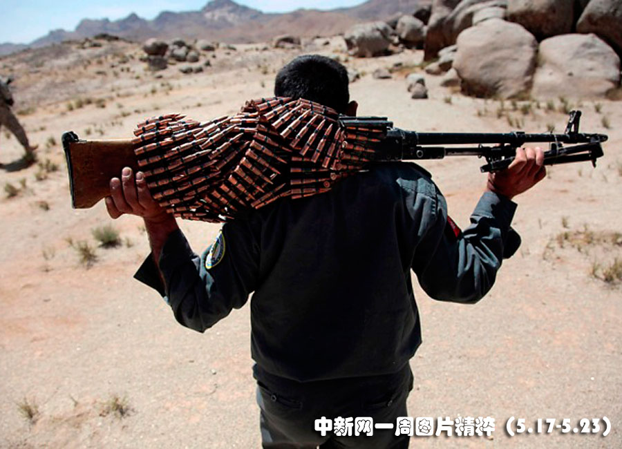 5月20日在阿富汗坎大哈,一名阿富汗国民警察扛着一挺机关枪和美国士兵一起巡逻。
