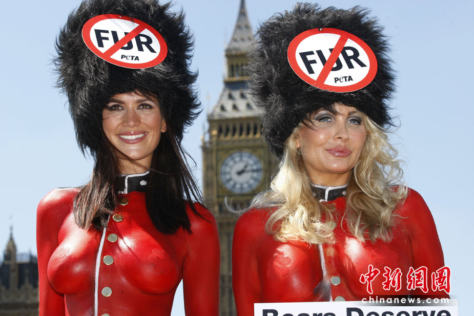 5月24日,伦敦,两位打扮成英国女王守卫模样的靓模在威斯敏斯特大桥上抗议女王守卫头戴熊皮制作的帽子,倡议保护动物。